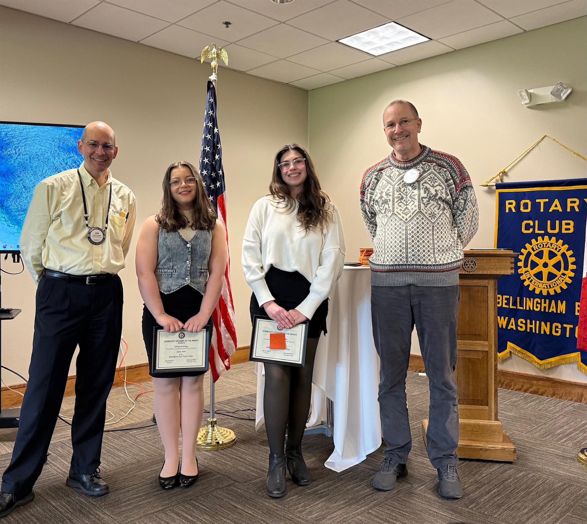 Rotary Youth Exchange Short Term Exchange ProgramL to R: Paria (Bellingham RYE) Sofia, (Verona, Italy RYE) John Purdie, (Club President) Debbie Kiene (Club YEO) Bellingham Bay Rotary club welcomed our Rotary Youth Exchange Short Term Exchange Program (RYE STEP) student, Paria, home from Italy and her Exchange sister from Italy, Sofia, to Bellingham during our club luncheon today. Paria shared highlights of her time in Italy as well as answered questions from members - as did Sofia. Very impressive young women! In this picture, club president John P. presents Sofia with our club flag. |